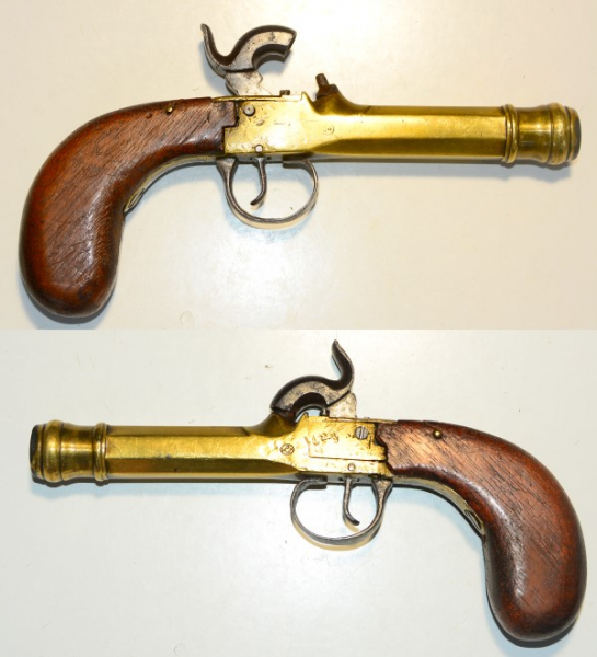 Original Perkussions-Pistole, Terzerol, Kasten und Lauf aus einem Stück Messing, Lauflänge ca. 87mm, Gesamtlänge 18,8 cm, Kaliber12,5mm, guter Zustand mit Alterspatina und technisch in Ordnung