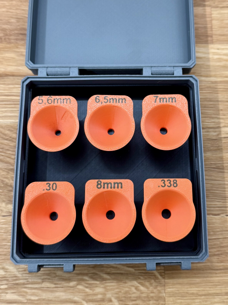 Der Trichter wird direkt auf die Hülse aufgesetzt und ist auf das jeweilige Kaliber abgestimmt. Durch die passgenaue Aufnahme steht er selbstständig und bleibt während des Befüllens stabil. Das funktionale Design aus dem 3D-Druck ermöglicht ein geringes Gewicht und kurze Wege für das Pulver. So arbeitest Du ruhig und ohne unnötiges Nachjustieren.