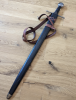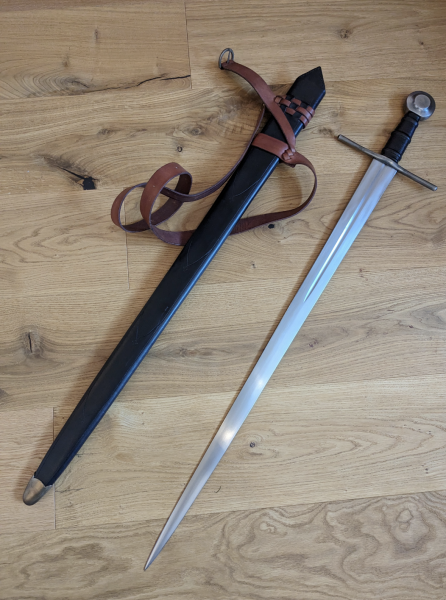 Ich verkaufe ein Schwert der polnischen HEMA-Schmiede Kriegerweapons.com, Typ "Komtur". Das Schwert ist scharf geschliffen und wird mit der zugehörigen Holzkern-Lederscheide mit Ledergürtel versandt. Ich bin der Erstbesitzer des Schwerts. Das Schwert wurde niemals benutzt (auch keine Schnitttests oder dergleichen). Es diente lediglich als Sammlerobjekt in der Vitrine. Der Zustand ist absolut neuwertig.