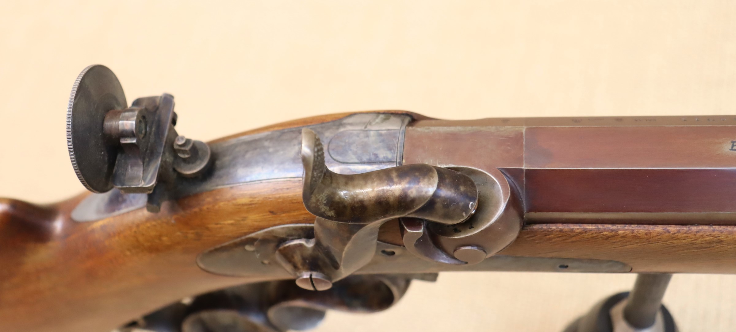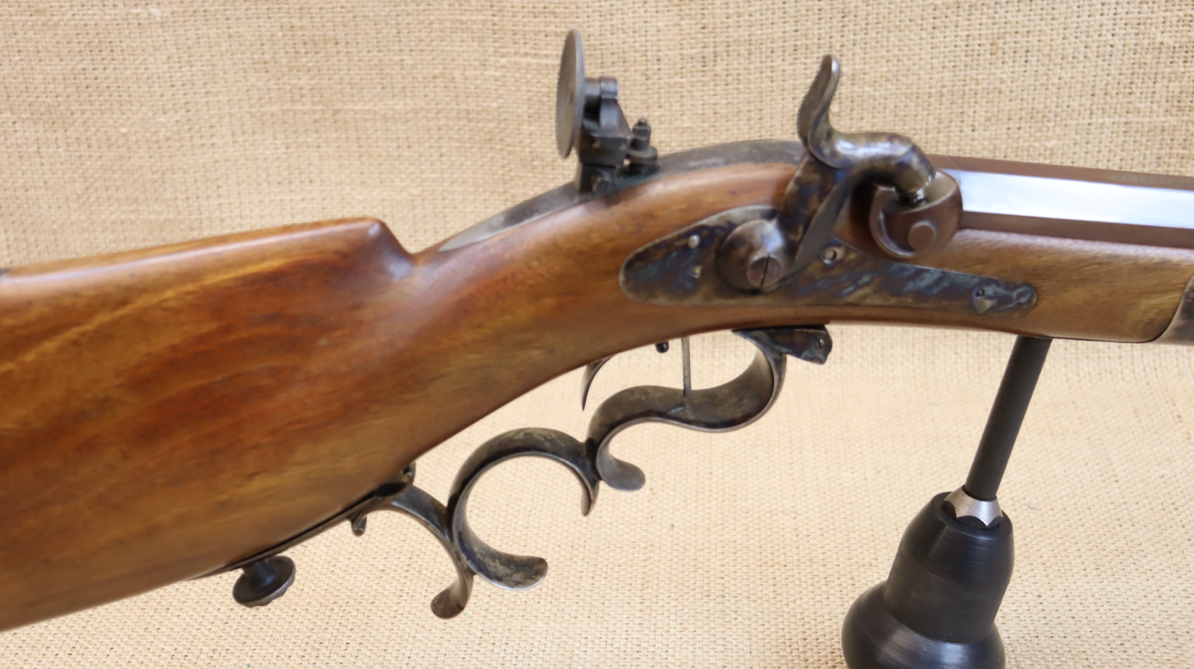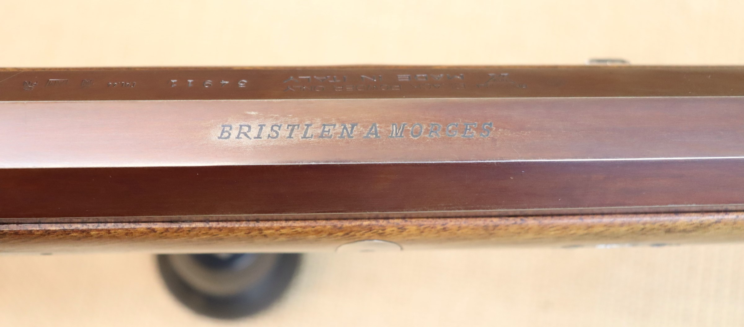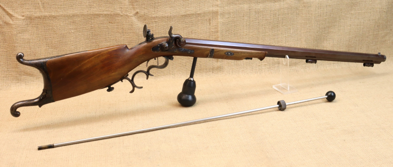 Schwere Perk.-Büchse mit bräuniertem Lauf. Guter Zustand, mit Gebrauchsspuren hauptsächlich an der Bräunierung. Lauf blank mit sehr gutem Zug- / Feldprofil. Inkl. Ladestock mit falscher Mündung. Leider fehlt der originale Ladestock. Kein Auslandsversand. Viele weitere Bilder zur Waffe finden Sie auf unserer Homepage unter: https: //www.collector-firearms.de/vorderlader-gewehre/1754-perkussions-buechse-pedersoli-bristlen-a-morges-kal-44bp.html