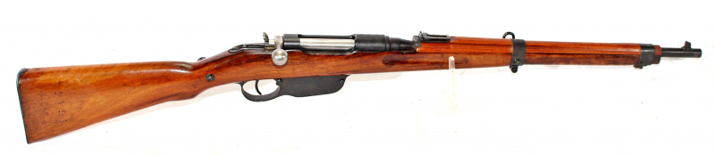 Speziell für Gebirgstruppen konstruierter Karabiner mit dem berühmten Geradezugverschlusssystem. Diese Waffen wurden in hoher Qualität gefertigt. Kastenmagazin für 5 Patronen. Diese Waffen hatten ursprünglich das Kaliber 8x50R und wurden Anfang der dreißiger Jahre auf das neue Kaliber 8x56R adaptiert. Dabei wurde der alte Wiener Beschuss im Jahre 1934 überstempelt. Alle Teile sind nummerngleich. Rahmenvisier. 50cm langer Lauf, innen im ersten Drittel mit Korrosion. Mit Neubeschuss.