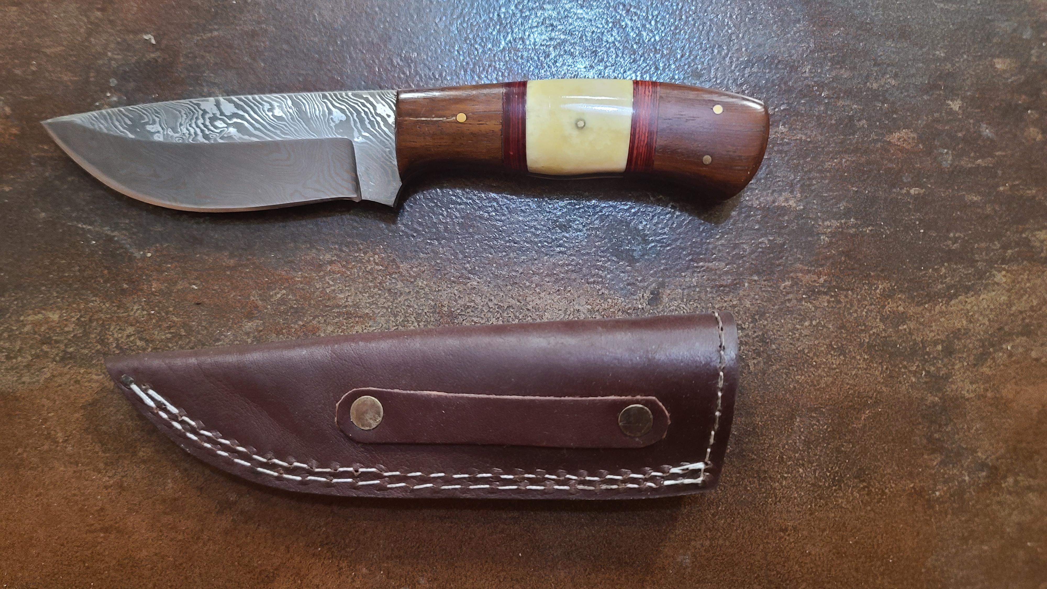 Sie erhalten ein wunderschönes, unbenutztes, damaszener Jagdmesser mit einer Lederscheide aus einer großen Sammlungsauflösung meines Vaters.