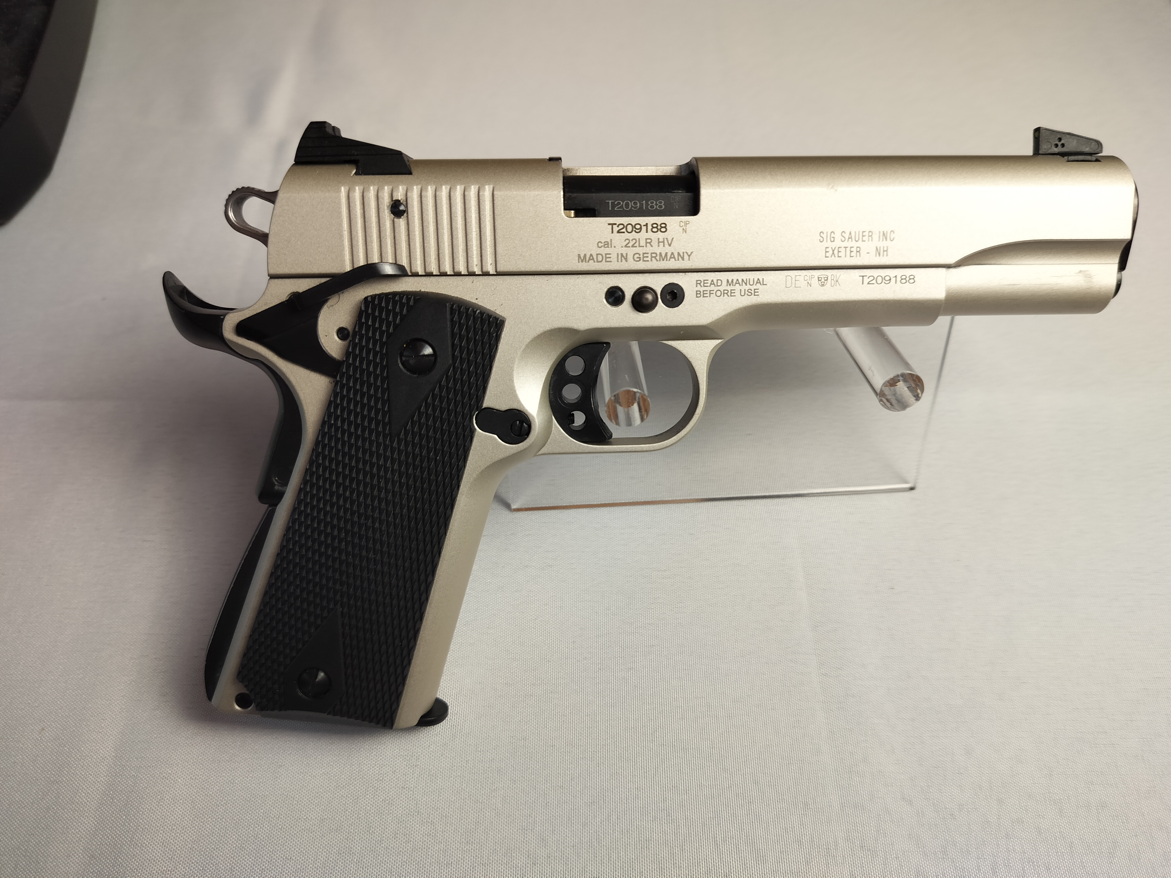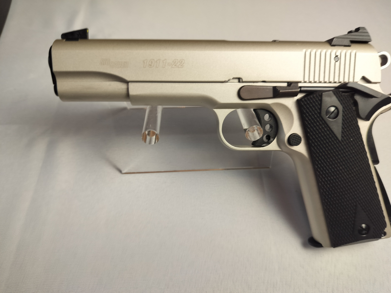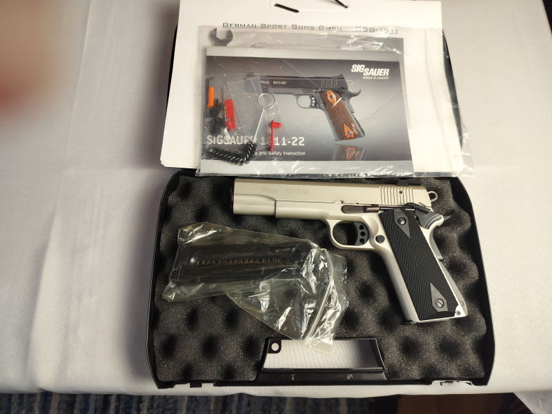 Pistole von GSG 1911-22 in Kal. .22lr, Starre Visierung, mit Koffer, Werkzeug, verschiedene Korne, und Koffer guter gebrauchter Zustand, wurde probegeschossen und läuft am besten mit HV Munition