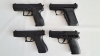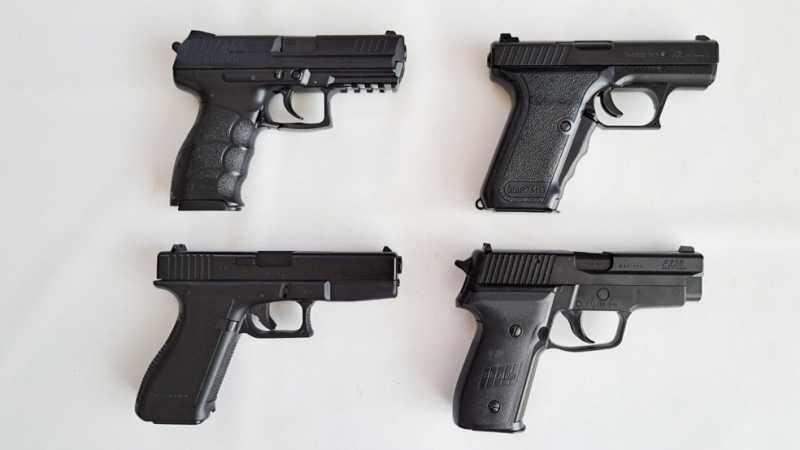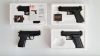 Zur Versteigerung kommt hier ein Konvolut mit vier Federdruck Softairpistolen im Kaliber 6 mm, alle Pistolen haben ein F-Zeichen.