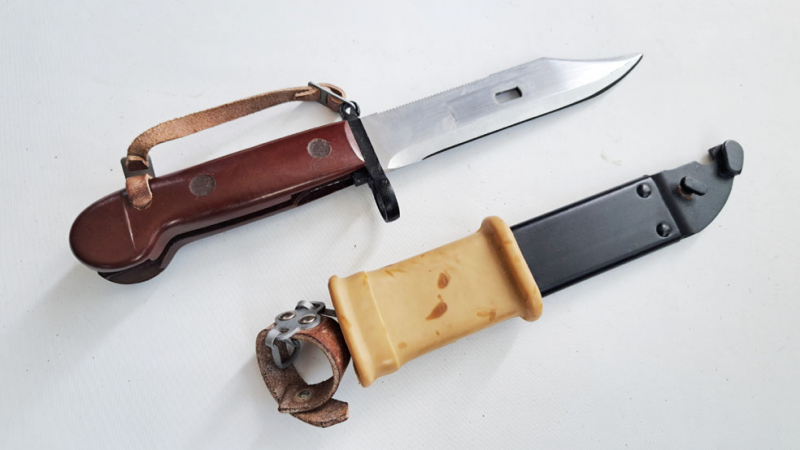 Blankwaffen Freunde aufgepasst! Zur Versteigerung kommt hier ein Kalashnikov AK-47 Bajonett mit rotbraunen Bakelitgriff im Originalzustand.