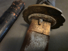 Geschärftes Katana (kurz) aus rostfreiem Stahl. Edle Ausführung mit Verzierungen in kupferfarbenem Antikfinish, inklusive schwarzer Holzscheide mit elegantem Glanzlack; Grief Länge 14 cm (Gesamt 54 cm), Klingenlänge 33 cm.