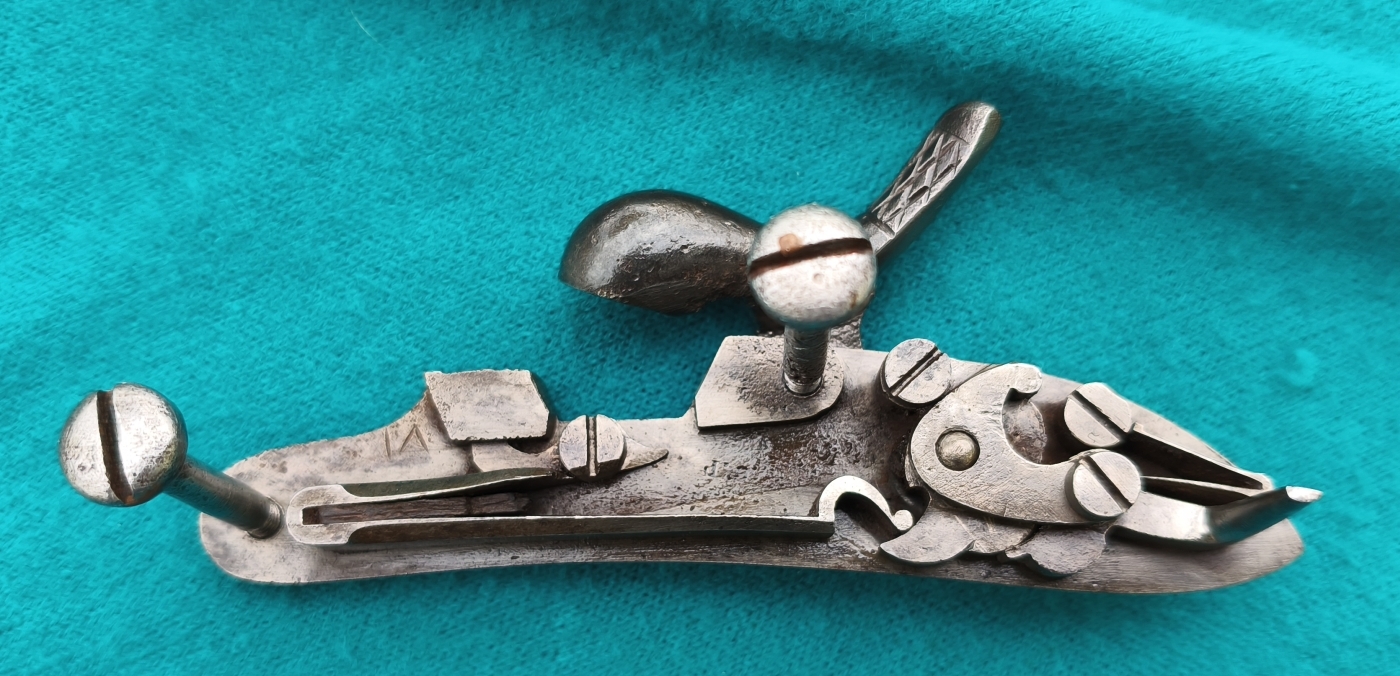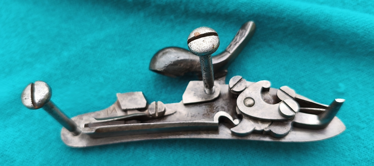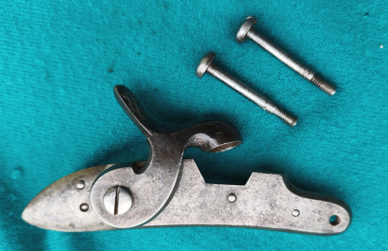 Militärisches Perkussionsschloss (Bayern) M1842. Schloßinnenseite gestempelt, beide Rasten in strammer Funktion. Originale zugehörige Schlossschrauben. Gesamtlänge 14cm.