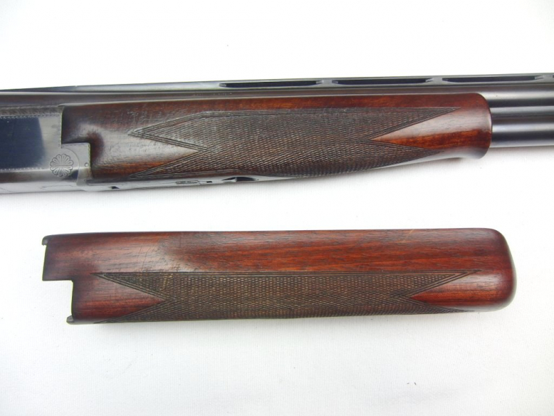 Sie bieten auf eine belgische Bockdoppelflinte FN B25 im Kaliber 12/70. Waffen-Nr.57936S76. 70cm Lauflänge mit rotem Leuchtkorn und 12mm Laufschiene, ½+Vollchoke ( Läufe hinter dem Patronenlage mit minimalen Gebrauchsspuren, ansonsten blank), brünierte Stahlbasküle mit Laufhaken-Verschluß (absolut dicht), umschaltbarer Einabzug mit Ejektor, Sicherung und Umschaltung auf dem Kolbenhals, vergo9ldeter, breiter Abzug, Nußbaumholzschaft mit 1,5cm Slippad-Schaftkappe, Riemenbügel vorne-der hintere fehlt. Schaftlänge 35cm, Gesamtlänge 111,5cm. Gebrauchsspuren auf dem Schaft, ansonsten guter Zustand. Inklusive breitem Holz-Vorderschaft. Ideale Flinte für Jagd und Sport!!!