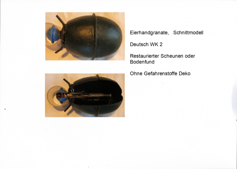 abzugeben. Eierhandgranate,,,, Schnittmodell,,,, Deutsch WK 2,,,,Privater Verkauf kein Umtausch oder Zurücknahme. Keine Garantie oder Gewährleistung. Versand mit Sendebeleg und Nummer,,,,, Ohne Gefahrenstoffe Deko,,,, Beschreibung siehe Bild,,, No Paypal