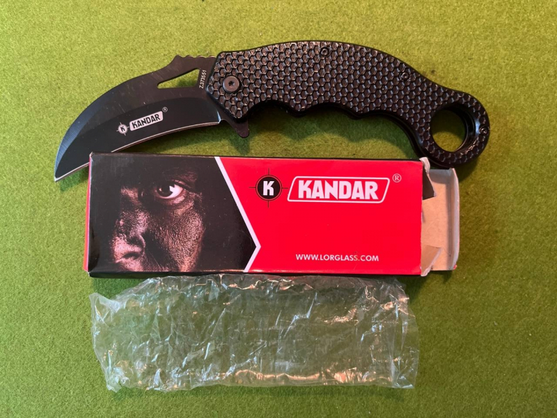 ganz aus schwarz lackiertem Edelstahl mit Gürtelclip. Kandar-Messer sind zwar in einer unteren Preiskategorie angesiedelt, aber sie sind hinreichend strapazierfähig und in der Wildnis sicherlich vielseitig einsetzbar.