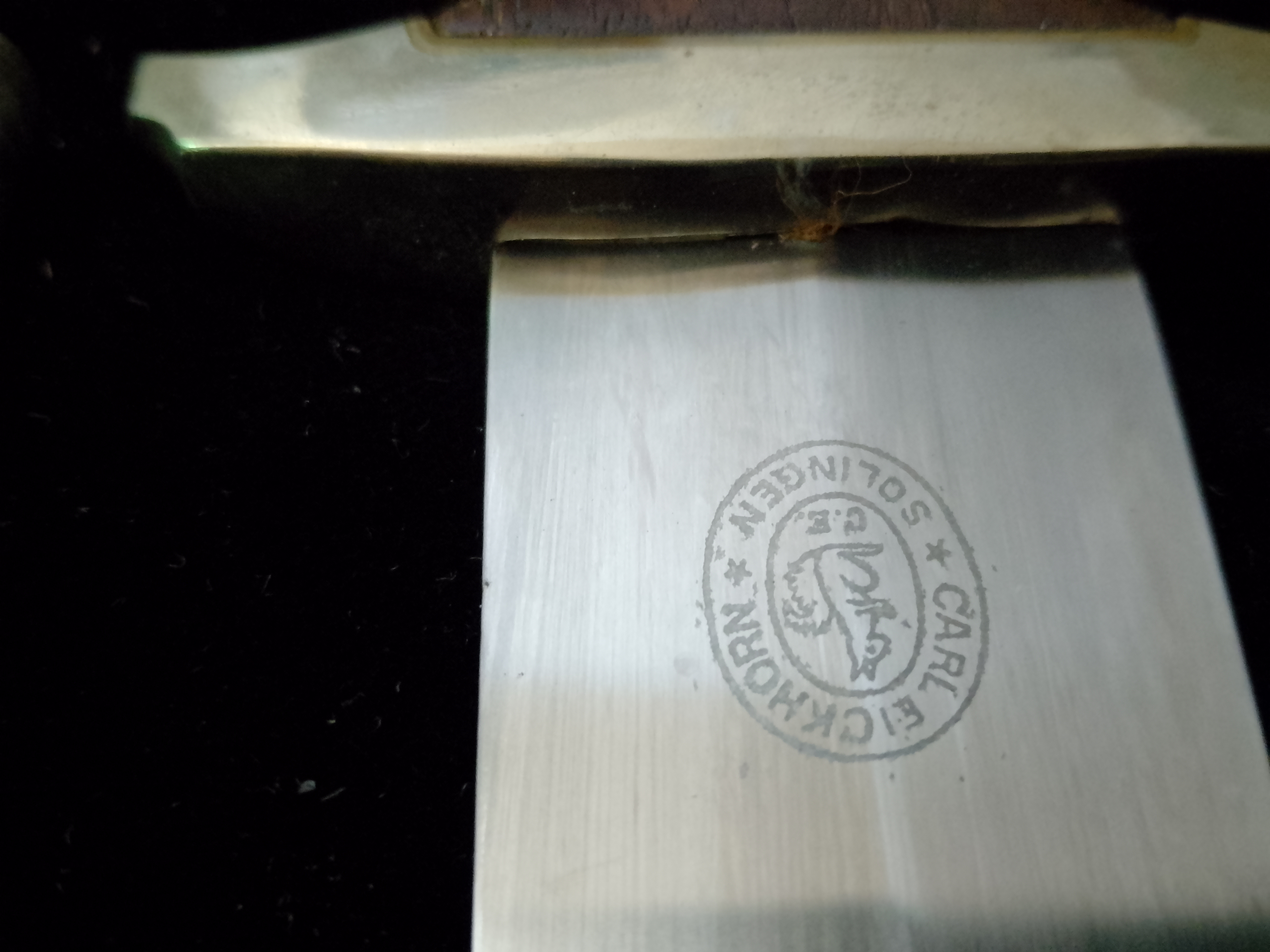 meiner Meinung nach sehr hochwertige Ausführung Neusilber Parierstangen mit einem Nussbaum Griff Klinge zweiseitig geschliffen wie eine xa Klinge vorderseitig Heizung alles für Deutschland rückseitig ganz früher Eickhorn Marke beides geätzt keine Laserung.