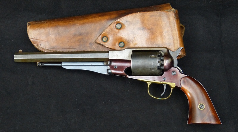 6 Schuss Replik mit äußerlich gewollter oder ungewollter Patina. Lauf und Patronenlager leicht matt. Inklusive einem schönen, stabilen Lederholster.