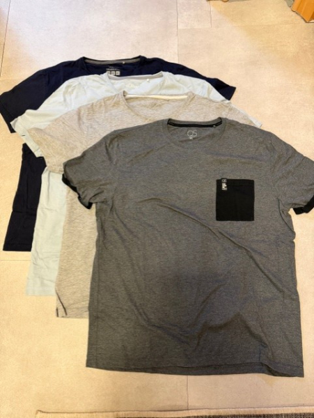 Angeboten werden 4 ungetragene S.Oliver T-Shirts im Set. Die beiden grauen besitzen eine Tasche. Alle Größe XL.