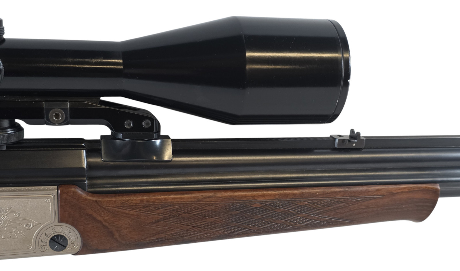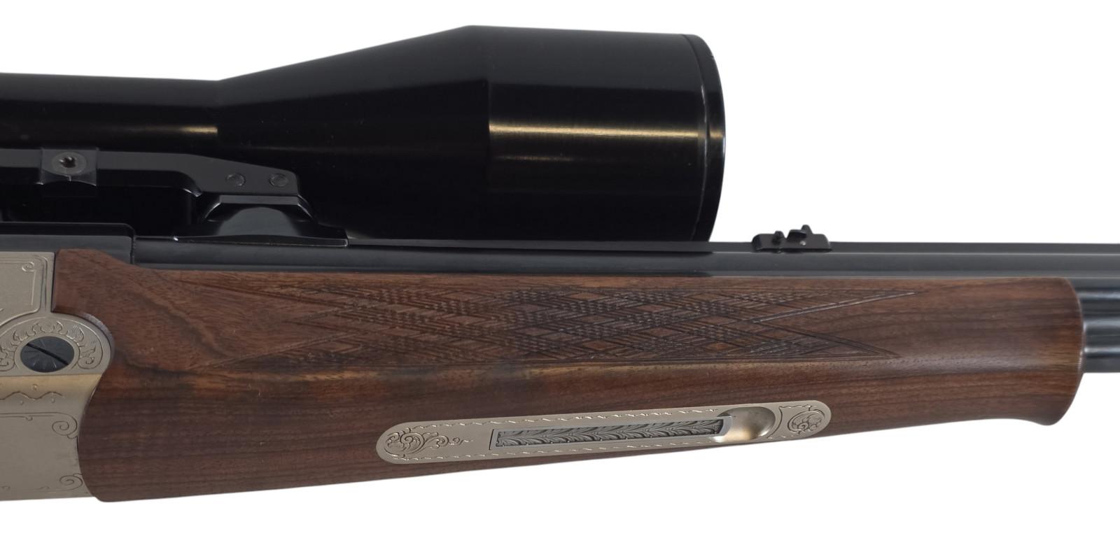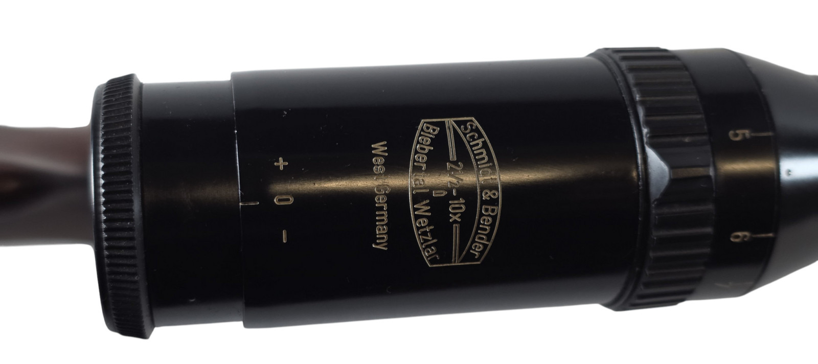 Optik: Kimme und Korn mit Schmidt & Bender 2,5-10X56 Abs.4 auf Schwenkmontage.