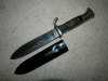 Altes Fahrtenmesser ohne Devise. Raute fehlt. Eine Griffschale ausgebrochen. Klinge schön. Griff Eisen vernickelt. Scheide ohne Hänger und mit kleiner Eindellung. Diese angepinselt. Zustand siehe Fotos. Privatauktion. Garantien werden keine gegeben.
