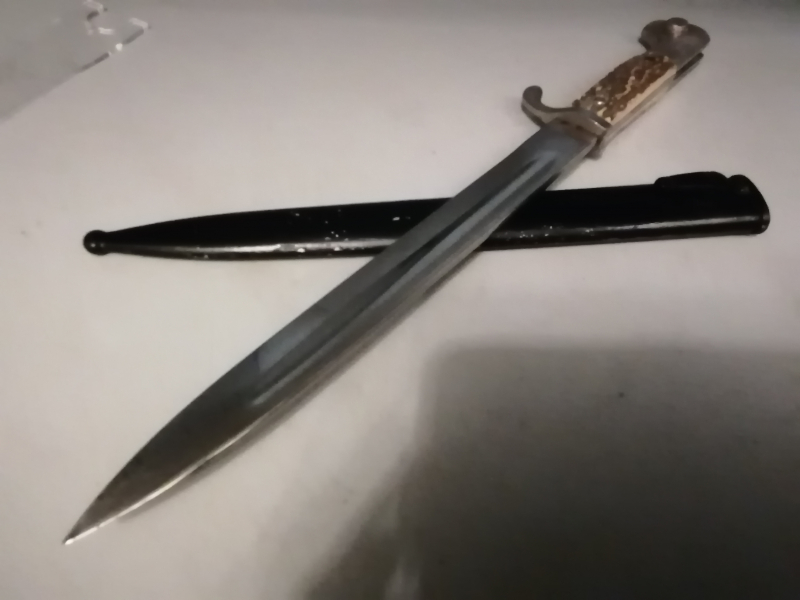 Original Seitengewehr mit Hersteller Eickhorn (das Logo bestens) , Gesamtlänge beträgt 39 cm, mit orig. Hirschhorngriffen, Griffe einwandfrei, die Klinge ebenfalls, auch fest, nichts wackelt, der Drücker ist gängig . Die Klinge passt einwandfrei in die Scheide und hat nur sehr leichte Gebrauchsspuren , wirklich nur sehr leicht .