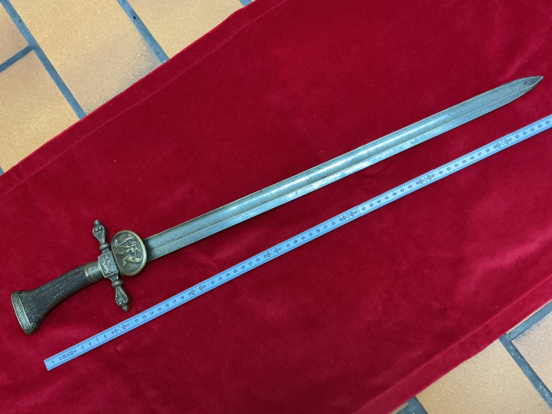 Aus Nachlass…..Hirschfänger. Ungeöffneter Originalzustand. Ohne Scheide. Ungewöhnlich breites Griffende aus Horn. Schöne Klingenätzung. Gedunkelt, keine Rostnarben. Sehr schönes Stück!!!! Griff Messinggarnitur, wie üblich, minimal wacklig. Bitte Bilder ansehen!!! Bei Fragen, fragen!!