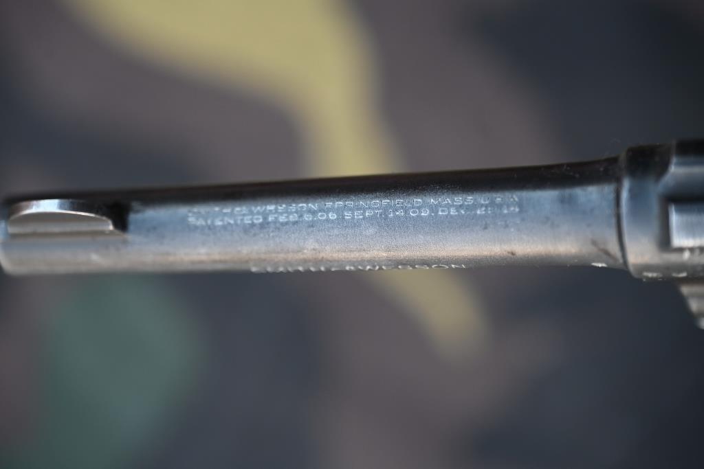 Stempelungen: Kaliberangabe „.38 S&W CTG“ überstempelt rechts auf dem Lauf, links „Smith & Wesson“; Seriennummer unten auf dem Griffstück neben der Trageringöse, “Made in U.S.A.“, S&W-Trademark-Logo rechts auf dem Rahmen, Patentdaten (1914) oben auf dem Lauf. Gültige bundesrepublikanische Beschusszeichen, datiert „68“ (= Beschussjahr 1968).