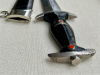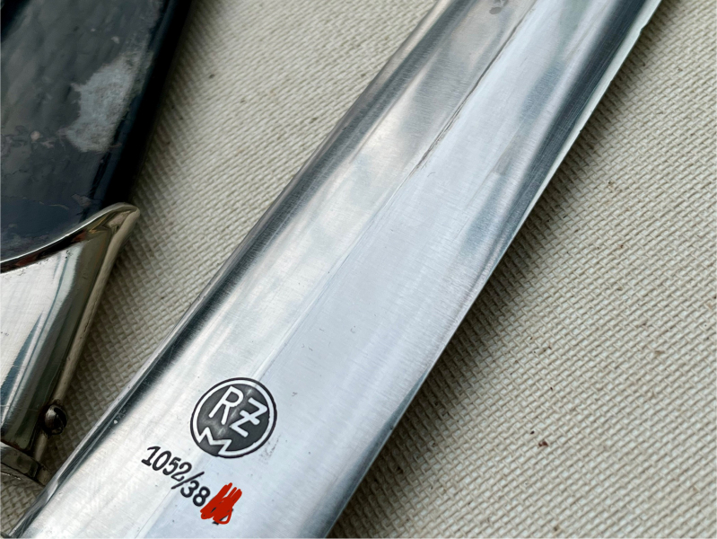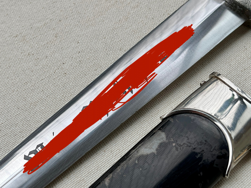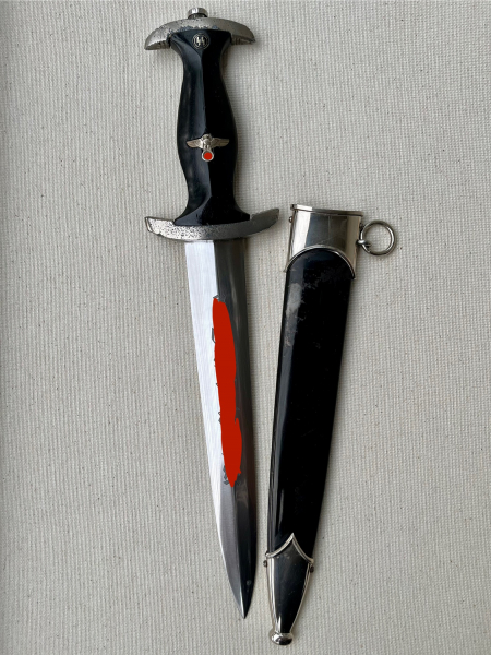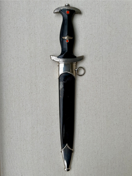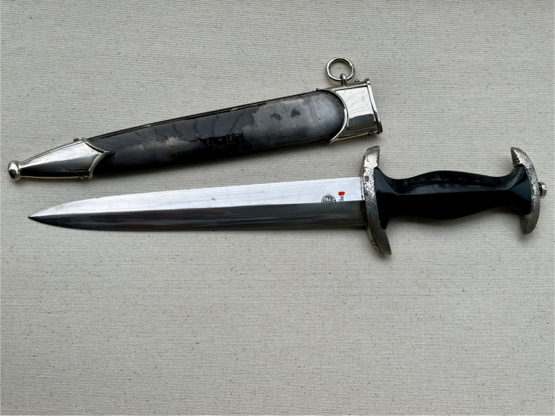 SS-Dienstdolch Modell 1933 von Puma (Puma-Werk Lauterjung & Sohn, Solingen), „RZM 1052/38 SS“, 1938. Die Klinge ist in hervorragendem Zustand. Die geätzte Inschrift „Meine Ehre heißt Treue“ und die SS-Vertragsnummer „RZM 1052/38 SS“ sind dunkel, klar und wunderschön ausgeführt! Die Spitze läuft perfekt zu und schließt bündig mit dem Griff ab. Die Klinge ist in einem sehr guten Zustand (NM). Sie weist minimale altersbedingte Verfärbungen auf, Pliestung perfekt erhalten und unbeschliffen. Die schwarz lackierte Stahlscheide ist in sehr gutem Zustand, allerdings ist der Lack teilweise absent. Kein Rost! Sie ist beulenfrei und weist noch über 50% der Lackierung auf. Die vernickelten Stahlbeschläge der Scheide sind nahezu frei von Altersspuren bis auf wenige fast nicht zu erkennende Ausnahmen. Vernickelung vollkommen intakt. Die Kugel ist perfekt rund und alle vier Schrauben sind intakt. Die Parierstangen aus Zinklegierung mit Nickelauflage sind in schlnem Altergerechtem Zustand in Anbetracht dass sich bei fast allen Stücken aus Zink gern die Vernickelung partiell löst. Untere Parierstange passt hervorragend zum oberen Scheidenbeschlag und seiner Krümmung des Mundblech. Der Griff aus schwarz gebeiztem/lackiertem Hartholz und in sehr guten Zustand wie der Rest des Dolches. Der massive Nickeladler ist detailreich gearbeitet und sitzt perfekt. Die Pastille in sehr schönem Zustand seiner Emaille und passgenau, ich denke nocv original eingelegt wie auch der Nickel/ Neusilber Griffadler. Ein solides Stück mit einer wunderschönen fast werkmässig erhaltenen Klinge! Bis auf den teils absenten Lack der Scheide und den Verfahrenstechnisch/ Materialbedingten Ablösungen der Vernickelung der Parierstangen ( Nickel hält schlecht auf Zink ).