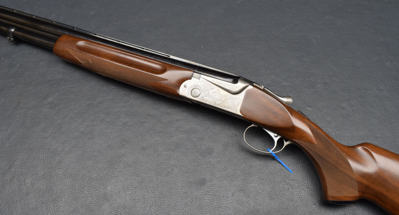 Stahlschrot-Beschuss! 10 mm breiter ventilierter Schiene, Messing Perlkorn, Ejektoren, Flankenverschluss, Einabzug mit Umschalter, heller Stahlsytemkasten mit Gravur Flugwild, Sicherungsschieber auf dem Kolbenhals,