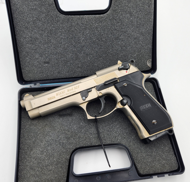Gebe hier eine tolle SRS Pistole der Firma Reck ab. Modell Miami 92F. Nachbau der klassichen Beretta AFS. Super Sammelwaffe. Kaliber 8mm Knall. Guter Zustand mit wenigen Gebrauchsspuren. Inkl. original Pistolenkoffer. Schauen Sie sich bitte die Bilder an. Beachten Sie auch meine anderen Angebote. Wenn Sie Fragen haben oder mehr Bilder wünschen melden Sie sich bitte rechtzeitig vor Auktionsende. Verkauf nur an Personen ab 18 Jahren. Privatverkauf ohne Garantie und Rücknahme. Käufer trägt das Versandrisiko. Dekoelemente gehören nicht zum Angebot.