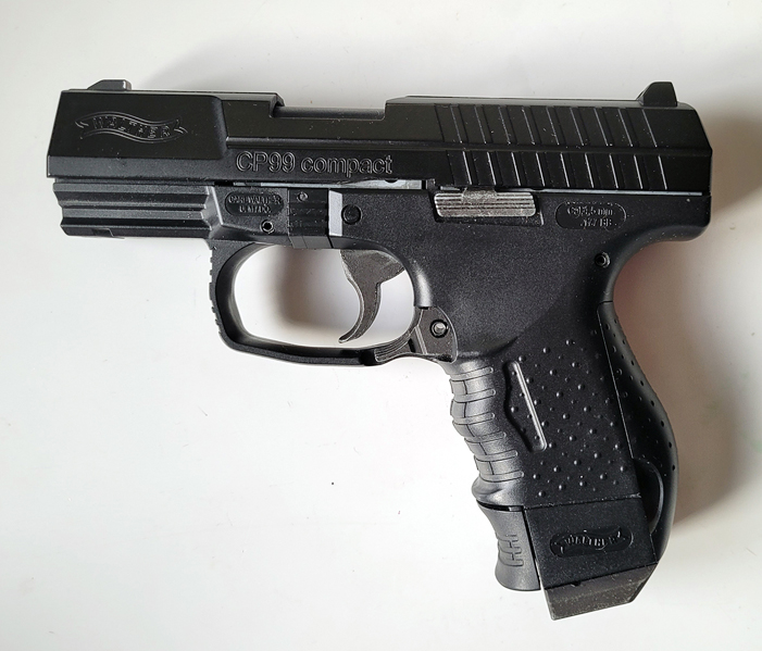 Umarex CP99 Compact, Kal. 4,5 (.177) Stahl-B, Blowback-System, Vollmetall-Schlitten, man. Sicherung, mit 2 (!) Magazinen á 18 Schuss, max. 3 Joule, 760 Gramm; mit Kunststoffkoffer, inkl. 2 CO2-Kartuschen.