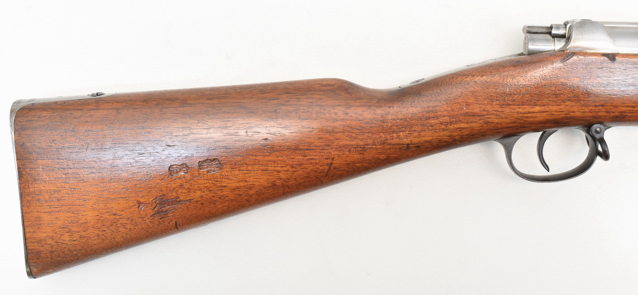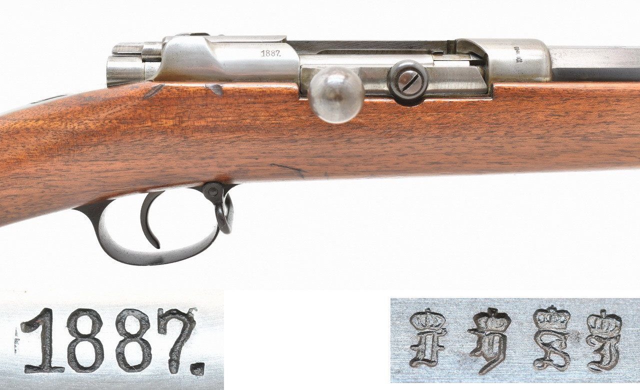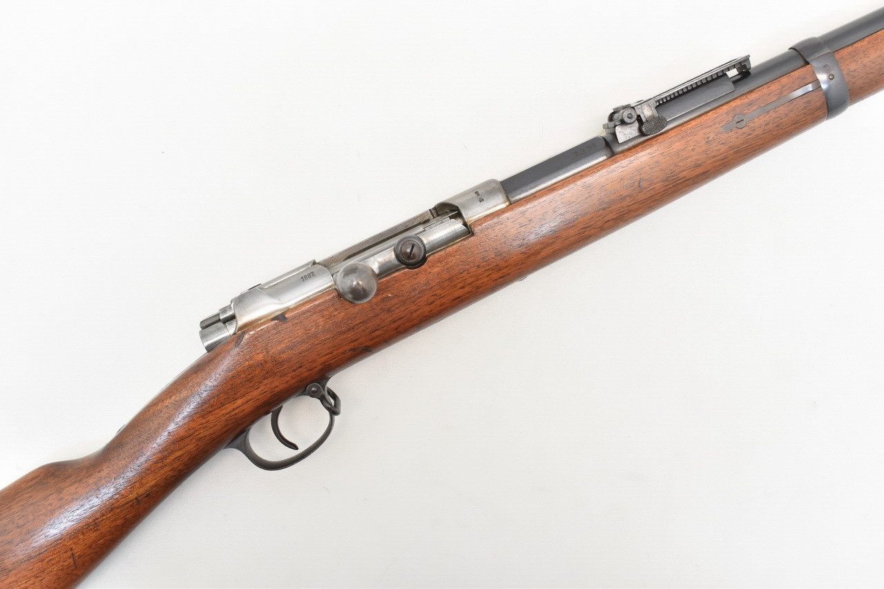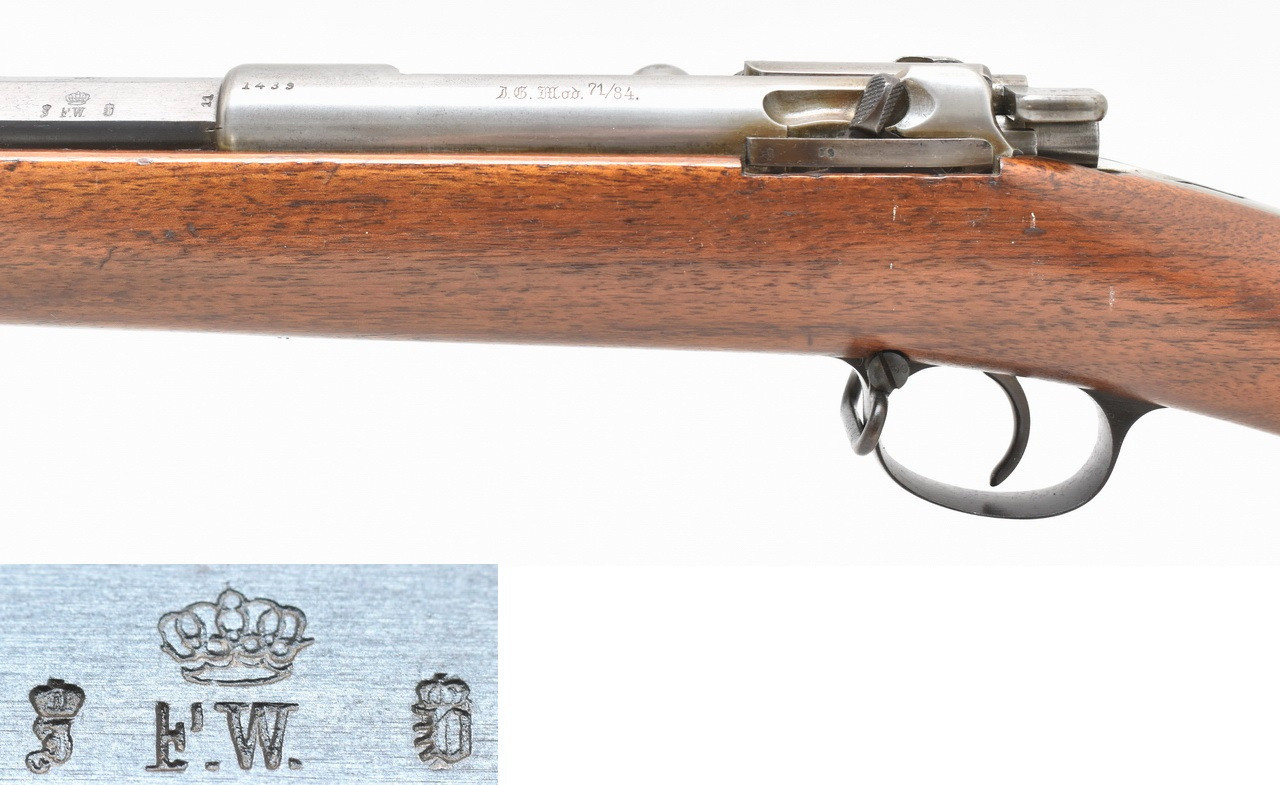 Nummerngleiches, achtschüssiges Repetiergewehr mit Röhrenmagazin. Das " Infanteriegewehr Modell 71/84 ". Eingeführt am 31.01. 1884 war das Gewehr als Standardwaffe der Infanterie, Jäger und Schützeneinheiten sowie der kaiserlichen Marine vorgesehen. Hergestellt im Kgl. Arsenal zu Spandau und Indienststellung im Jahre 1887. Spiegelblanker Originallauf. Schaftkappe mit Truppenstempel " K.A.R. E.4.123. " KAISER ALEXANDER GARDE - GRENADIER REGIMENT Nr. 1 4. Ersatzkompanie, Waffe Nr. 123. Unüberarbeitete Metallteile mit leichten Gebrauchs- und Lagerungsspuren. Details siehe Bilder.
