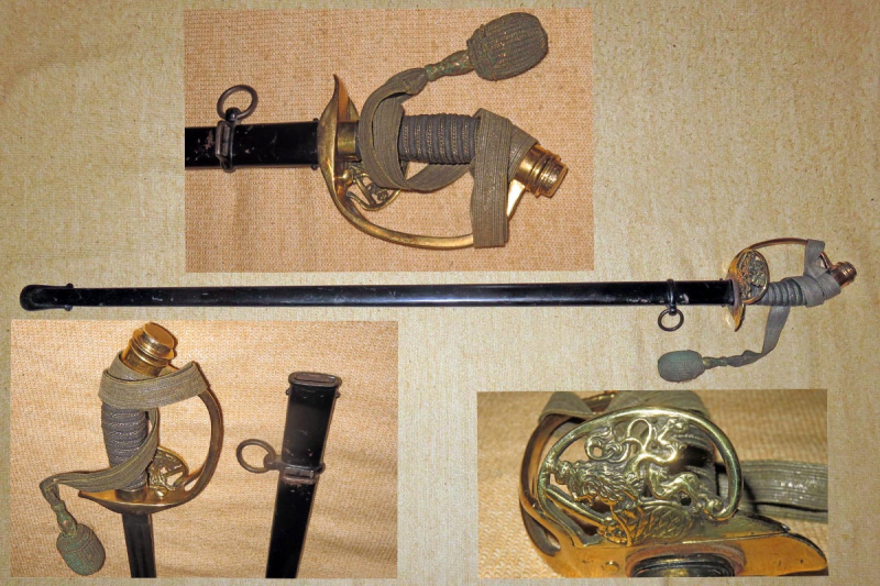 Degen mit einem Gefäß aus Messing, Klappscharnier mit bayerischen Wappen (Fingerschlaufe fehlt), Griff mit Fischhaut und Dreifach-Wicklung, Klinge vernickelt (leicht fleckig – keine Stempel), Portepee, Scheide, mit einem beweglichen Ring noch in Originallackierung.