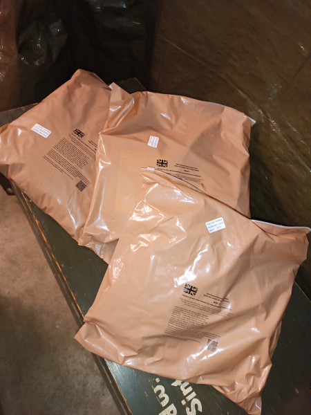 Ich baue meinen Not Vorrat um und trenne mich daher von einer größeren Menge der MREs. Sie erhalten 3 Tüten aus einem neuen Karton welches Menü kann ich nicht im Detail sagen. Es kommt was gerade da ist.