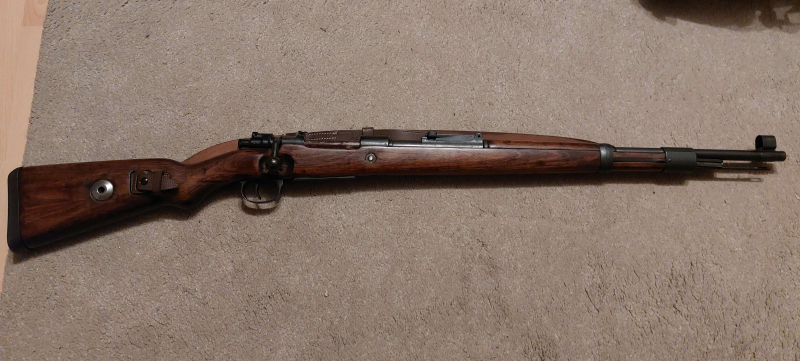 Hallo, ich hatte eigentlich nicht vor, noch mehr meiner Waffen zu verkaufen. Leider hat der Verstand am Ende über das Herz triumphiert und daher biete ich hier doch noch meinen schönen, norwegischen Kar98k F1 zum Verkauf an. Diese Kar98k wurden nach dem Krieg von Norwegen erbeutet, auf 30-06 umgerüstet und mit U-Kimme + geradem Korn versehen, ähnlich Schwedenmauser, bekannt für sehr, sehr gute Qualität und Präzision mit den neuen, nordischen Läufen. Dieser Kar98K F1 wurde auf Basis eines "Mittelkriegs"-Modells umgerüstet: Alle Teile noch geschmiedet, noch keine späten Stanzteile, aber schon Schichtholzschaft und hohe Schaftkappe sowie volles, vorderes Laufband statt H-Band, meiner Meinung nach war dieses die "effizienteste" Variante des Kar98K in Bezug auf Kosten, Effizienz und Stärke. Die Herstellermarkierung auf Systemhülse ist BYF 42, der Verschluss ist glatt wie öl und alles am Gewehr funktioniert wie es soll, der Lauf ist spiegelblank. Im dritten Bild die "Windmühle unter Friedenstaube" ist nur von mir raus-retuschiert, alle alten Markierungen sind vollständig erhalten, die Norweger haben da meines Wissens nach nichts "entnazifiziert", nur ihre eigenen Stempel dazugehauen. Der Riemen ist Repro und gehört zum Angebot dazu. Bitte beachten sie, dass ich NICHT VERSENDE, die Waffe müsste bei mir in 60437 Nieder-Erlenbach abgeholt werden. Bei Interesse können gerne weitere Bilder oder Infos geschickt werden, einfach anfragen (Email: y.schairer@t-online.de) :). Da Privatverkauf keine Garantie und keine Rücknahme.