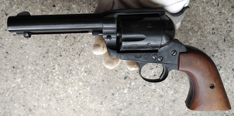 Sie bieten auf einen großen, schweren Western Single Action Revolver im beliebten und preisgünstigen Kaliber 9mm Knall, eine gelungene und sehr formschöne Kopie des legendären Colt SAA Revolvers. Es ist ein selten gewordenes, deutsches Qualitätsprodukt, 1991 bei der Firma H. Schmidt Waffentechnik in Ostheim (Rhön) gefertigt. Dieses Unternehmen fertigte seit dem Ende des ersten Weltkriegs hochwertige Schußwaffen. Das wuchtige Gerät ist sehr gut verarbeitet, es wurden seinerzeit bis auf wenige Abänderungen baugleiche Schwesternmodelle in den verschiedensten scharfen Kaliber produziert, was für die Qualität und Haltbarkeit dieser Modellreihe sprechen dürfte. Man hat damals einfach noch dieselben Teile aus der Produktion der scharfen Modelle auch für die Platzpatronen-Auführungen verwendet, natürlich entsprechend abgeändert. Dadurch sind Trommelachse, Abzug, Hahn und die inneren Mechanik-Teile aus Stahl. Der Revolver hat schöne Echtholz-Griffschalen aus Nußbaum. Der Texas Scout ist zerlegbar, man kann wie beim Original die Trommel entnehmen, was das Laden und Reinigen sehr erleichtert. Frühe PTB 241, also noch aus der Zeit in der ein Schreckschußrevolver zum Schießen gemacht wurde. Robust, aber sicher! Der Revolver hat ein Schlagbolzensystem im Rahmen und einen Sicherungsrast, der als Fallsicherung wirkt. Der Revolver ist in dem Zustand, in welchem ich ihn erhalten habe und wurden nur eingeölt, ich habe ihn weder verändert, noch gereinigt, bespielt oder damit geschossen und beschreibe ihn nach dem äußerlichen Augenschein, wie er sich mir darstellt. Der Revolver wurde nur Probegeschossen und dann eingelagert, er ist in sehr gutem Zustand, es gibt Kratzer von der Lagerung im Stahlschrank und vom Trommeltransport an der Trommel. die Griffschalen sind an den Kanten bestoßen. Der Zustand der Mechanik ist sehr gut, die Federn sind stark, die Trommel sitzt perfekt! Es wird nur der Revolver mit der Bedienungsanleitung verkauft, ohne jegliches Zubehör! Lauf und Trommel sind nicht magnetisch. Die Photos sind Teil der Artikelbeschreibung.