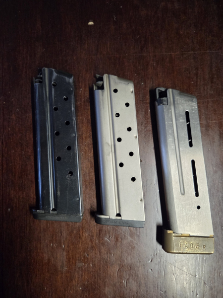 Verkaufe drei 1911er Magazine davon ist ein Wilson Combat mit extra Messing Magazinboden, ein Colt Magazin brüniert mit Pachmayr Magazinboden und ein Colt/Metallform auch mit Pachmayr Magazinboden. Egun ich Versand der Käufer. Keine Garantie,Umtausch oder Rücknahme. EU Versand ca. 20€.