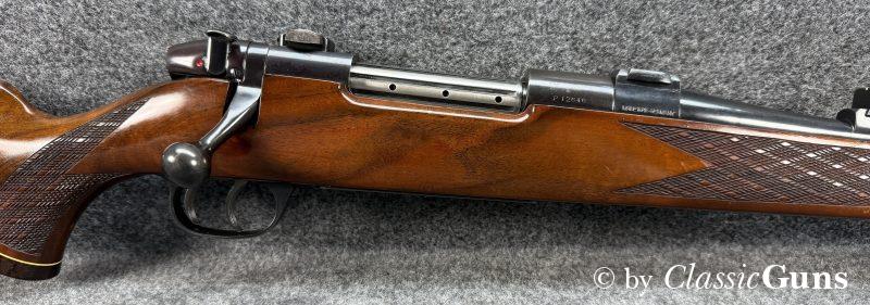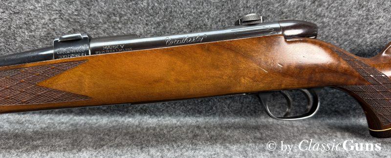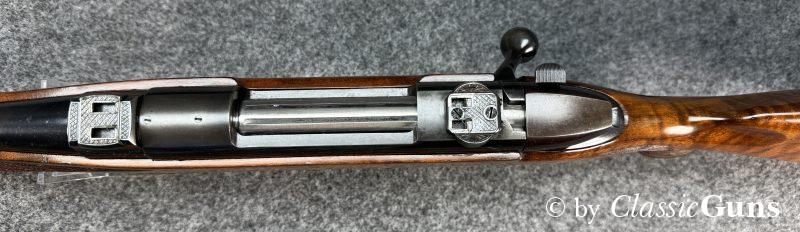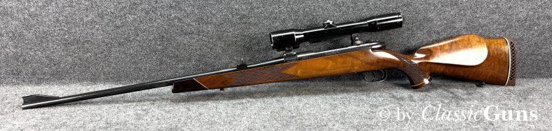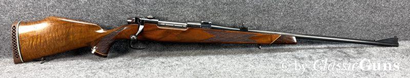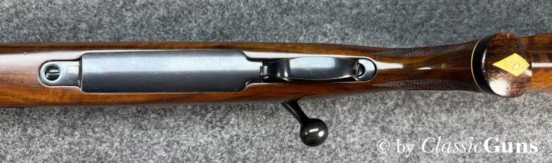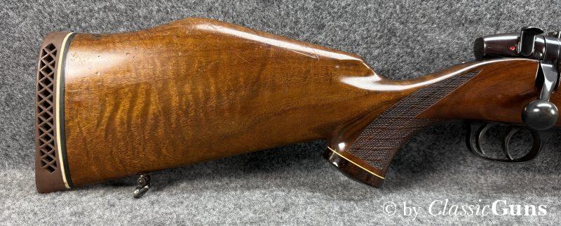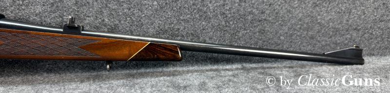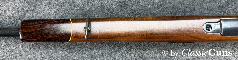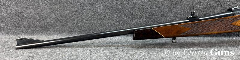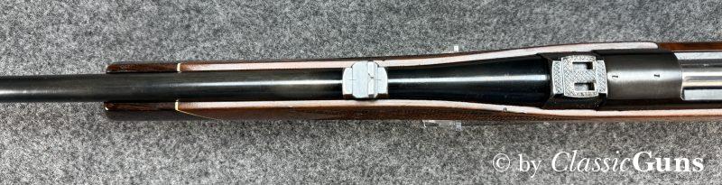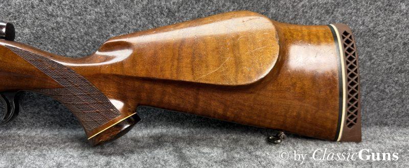 610 mm langer Lauf mit sehr gutem Zug-/ Feldprofil und ein paar harmlosen Rostnarben unmittelbar vor dem Patronenlager. Gut erhaltene Brünierung mit leichten Gebrauchsspuren. Der Nussbaumschaft mit Edelholzabschlüssen ist frei von Rissen, zeigt aber die üblichen Gebrauchsspuren einer jagdlich geführten Waffe.