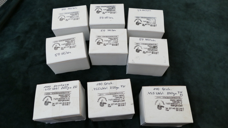 Je 300 Hülsen und Geschosse Webley & Scott, Kal. .455 W&S, Hülsen unbenutzt, Geschosse 3 Pack. zu je 100St. (siehe Bilder).