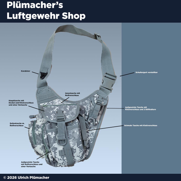 Sie bieten hier auf eine Schulter-Umhängetasche im AT-digital Design. Diese praktische und robuste Tasche eignet sich ideal für den Einsatz am Schießstand, bei Outdoor-Aktivitäten oder im Alltag.