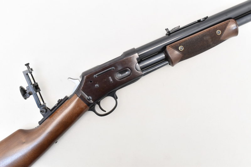 " Slide - Action / Pump - Action Rifle " Vorderschaft - Repetierbüchse im " COLT Model 1884 Lightning Magazine Rifle " Style aus Produktion des bekannten italienischen Herstellers DAVIDE PEDERSOLI. Spiegelblanker 23,9" Rundlauf. Italienischer Beschuß. Frankonia Vertriebsstempel. Höhen- und seitenverstellbare Pedersoli " Middle Range Creedmoor " Dioptervisierung. Messing Klapp - Korntunnel mit Perlkorn. 332mm lange Schäftung für Rechts- und Linksschützen ( Schaftlänge gemessen vom Abzug bis Mitte Schaftkappe ). Systemkasten mit " fleckiger " Brünierung. Gebrauchsspuren sind vorhanden. Details siehe Bilder.