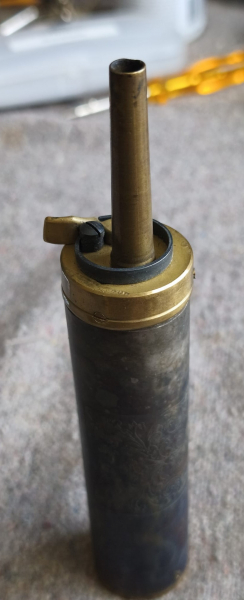 Sie ist aus Messing und der Behälter ca.12 cm hoch und im Durchmesser 4 cm.
