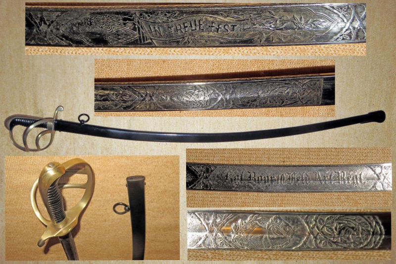 Säbel der bayerischen Feldartillerie mit dreispangigem Gefäß und gerippten Bakelitgriff, Stahlscheide mit einem Ring und aufwendig beidseitig geätzte Klinge (Ornamentik, Trophäenmuster und Inschrift „IN TREUE FEST“ „ Kgl. Bayr. 10. Feld Art. Regt.“) siehe Bilder, keine Marke.