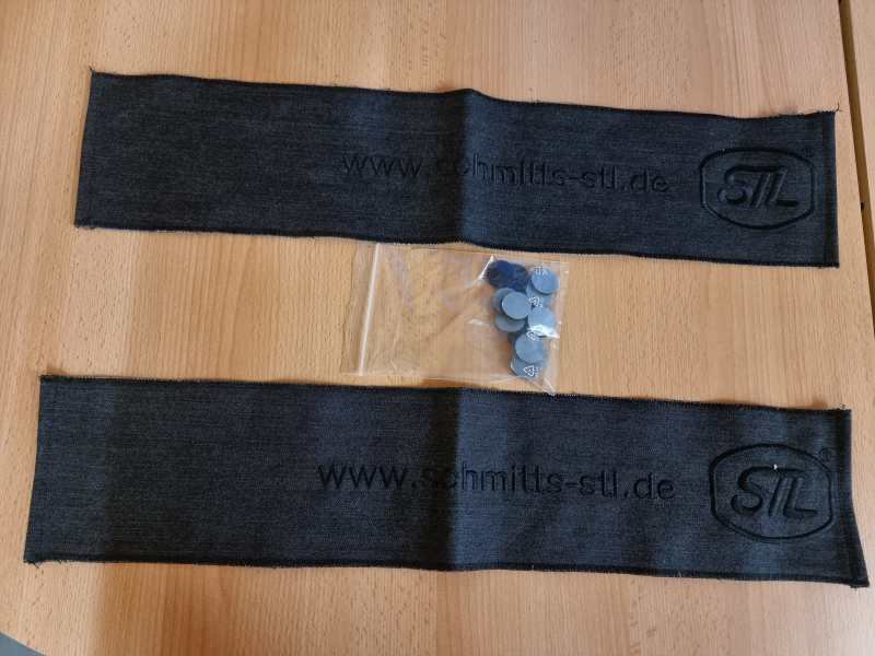 Das Angebot besteht aus einem 2-er Set Schmitts-STL-Flimmerbänder aus Stoff mit Klett-Befestigungspunkten für Zielfernrohrgewehre, Größe: 58 cm lang und 12,5 cm breit. Eine Abgabe erfolgt nur komplett, ein Einzelverkauf ist leider nicht möglich. Die Klett-Befestigungsplättchen werden direkt auf den Lauf geklebt; das Gegenstück dann auf die Unterseite des Flimmerbandes. Die Befestigungsplättchen lassen sich, falls diese nicht mehr benötigt werden, problemlos wieder entfernen.