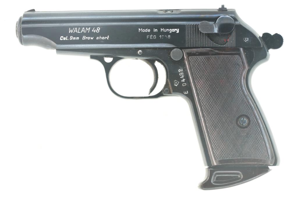 Modellbezeichnung "WALAM 48", Kaliberangabe "Cal. 9 mm Brow short" und Hinweis „Made in Hungary“ nebst Baujahr „FEG 1958“ links auf dem Schlitten. Kleiner Importeurstempel "BRIGANT" rechts auf dem Griffstück vor dem Abzugbügel.