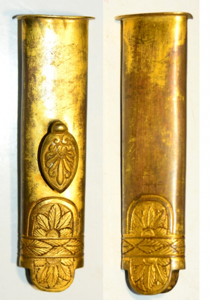 Original Mundblech von Degenscheide, für Klingenbreite bis 22mm, Messing mit Resten von Vergoldung, Höhe 10,1 cm