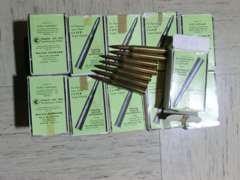 Aus dem Nachlaß eines Jägers werden 107 Stück der seltenen Jagd-Kugel-Patronen Kal. 7X75 R angeboten. Diese wurden mal von einem auch verstorbenem Gewerblichen Wiederlader neu geladen . Sind alle in den Original 10er Packungen. Auf dem Hülsenboden steht: "W.Gehmann 7X75R Super Express.Geschoß: Teilmantel Spitz. Wie diese Patronen geladen sind, weiß keiner. Das würde man aber beim Zerlegen einer Patrone herausbekommen können. Evtl. paßt ja sogar der Probeschuß. Da im Auftrag: Keine Rückgabe möglich. Keine Garantie.
