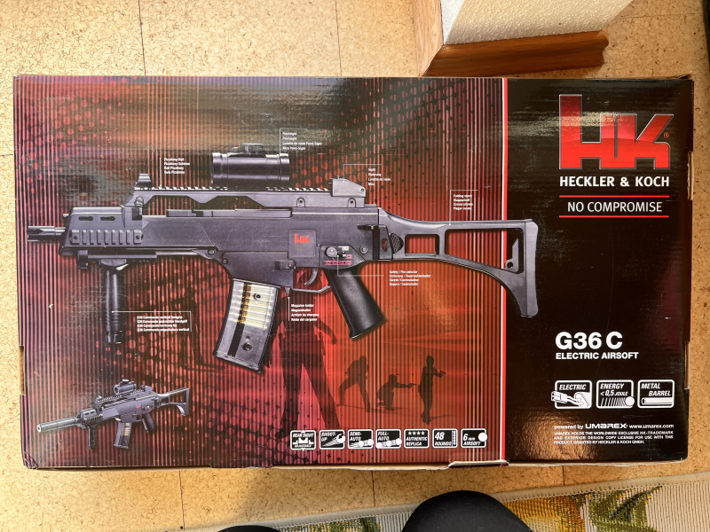 Verkaufe meine elektrische Softair Umarex HK G36C (lizenzierter Heckler-&-Koch‑Nachbau, Kaliber 6 mm BB, Energie < 0,5 Joule, daher ab 14 Jahren frei).