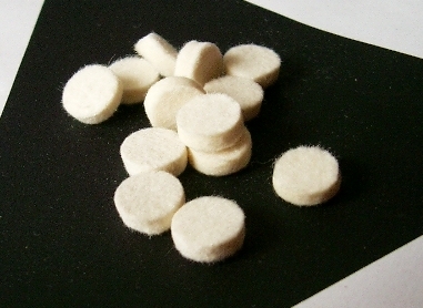 Die Pfropfen sind aus 3mm dickem weißem Filz in VFG Qualität. Sie sind zu 100 Stück im Plastikbeutel verpackt.