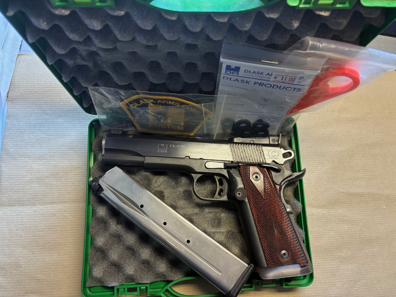 Die sehr seltene Pistole ist die Nachbildung der legendären Colt M1911 Government und der wahre König der Custom Line von DLASK ARMS CORP., die spezialisiert ist in der Produktion von handgefertigten Waffen nach Kundenwunsch. Alle Teile werden individuell angepasst und poliert, damit sie einwandfrei und harmonisch wie eine Einheit funktionieren. Weitere Bilder auf Anfrage.