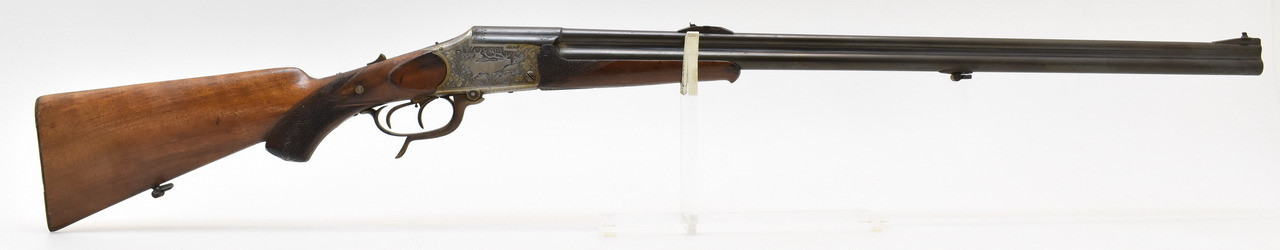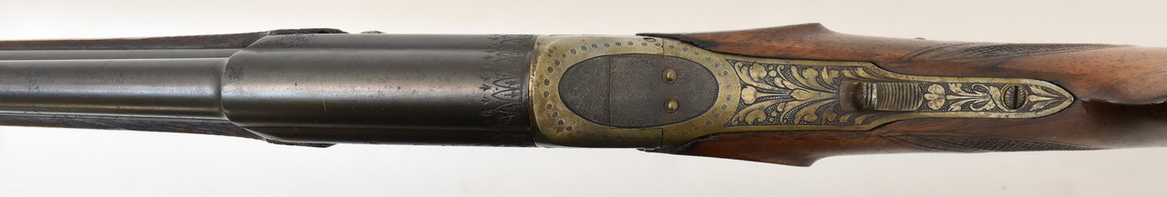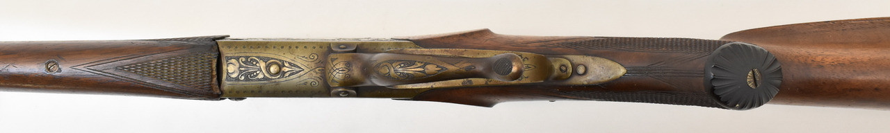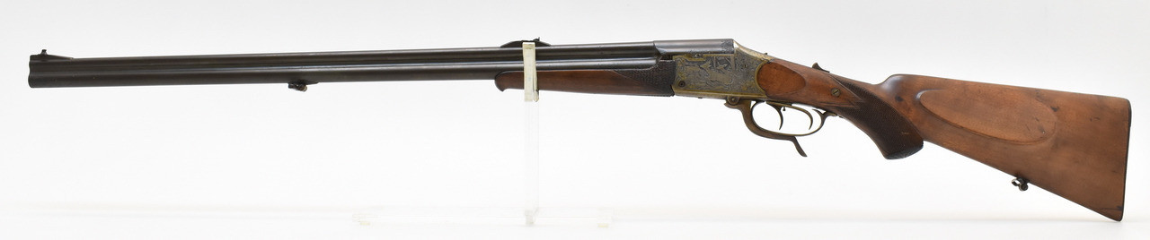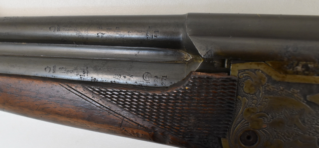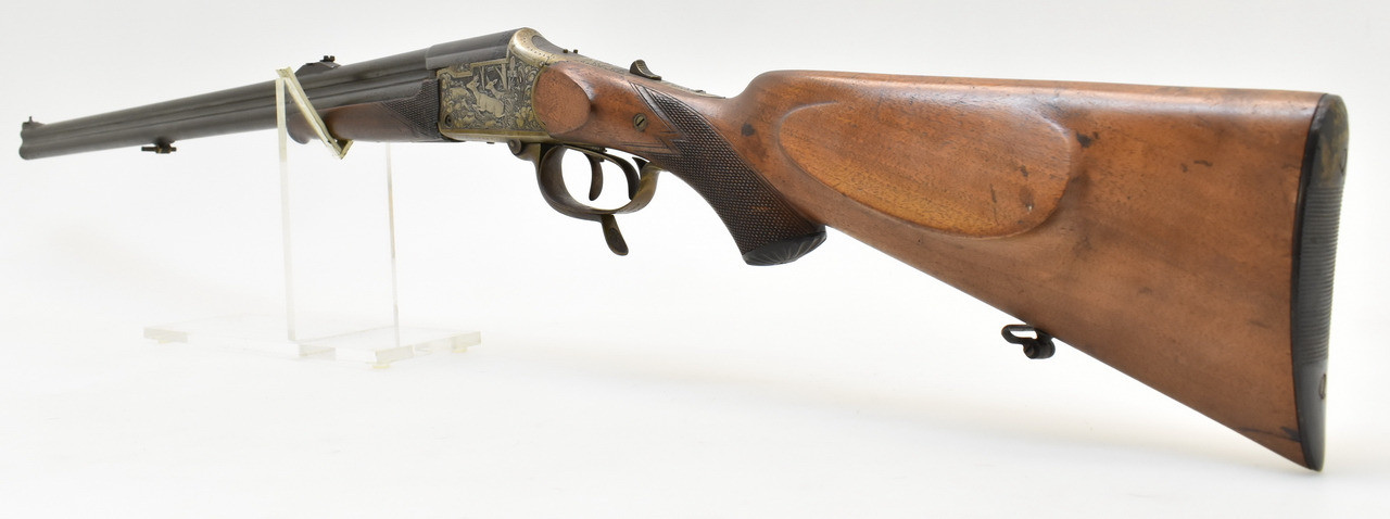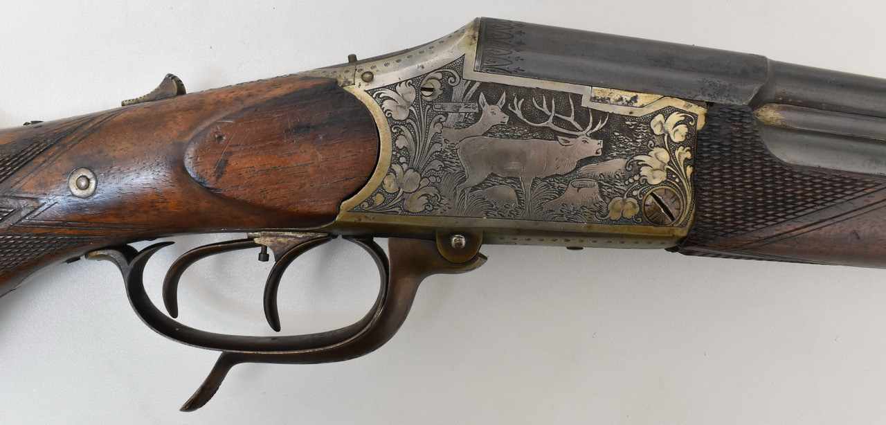 Bockbüchsflinte mit matten Läufen, der Verschluss mit Spiel. Auf dem Lauf ist Theodor Wichmann, Mühlhausen/Thü. eingeschlagen, auf der Basküle findet sich die Waffennummer und JGA im Oval. Läufe waren außen rostnarbig, wurden neu brüniert. Schaftlänge 35cm, mit Backe und Pistolengriff. (gemessen vorderer Abzug bis Mitte Gummischaftkappe)