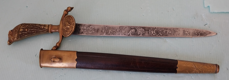 Alter Hirschfänger mit Wildschweinkopf, Klingenätzung Gott mit uns. Zustand siehe Fotoserie