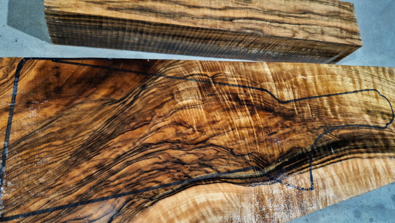 Die ersten Aufnahmen entstanden auf einem leicht angefeuchteten Holzbrett, um die Farben und die Schönheit des fertigen Produkts realistischer darzustellen. Das letzte Bild zeigt die Maße in Zentimetern. Die Konturen wurden auf die tatsächlichen Abmessungen der Blaser F3 übertragen. Die Teile wurden fünf Jahre lang luftgetrocknet. Auf Dampftrocknung wurde verzichtet, um die Farben und die natürlichen Harze des Holzes zu erhalten. Das Ergebnis ist ein elastischerer, festerer und schönerer Schaft