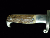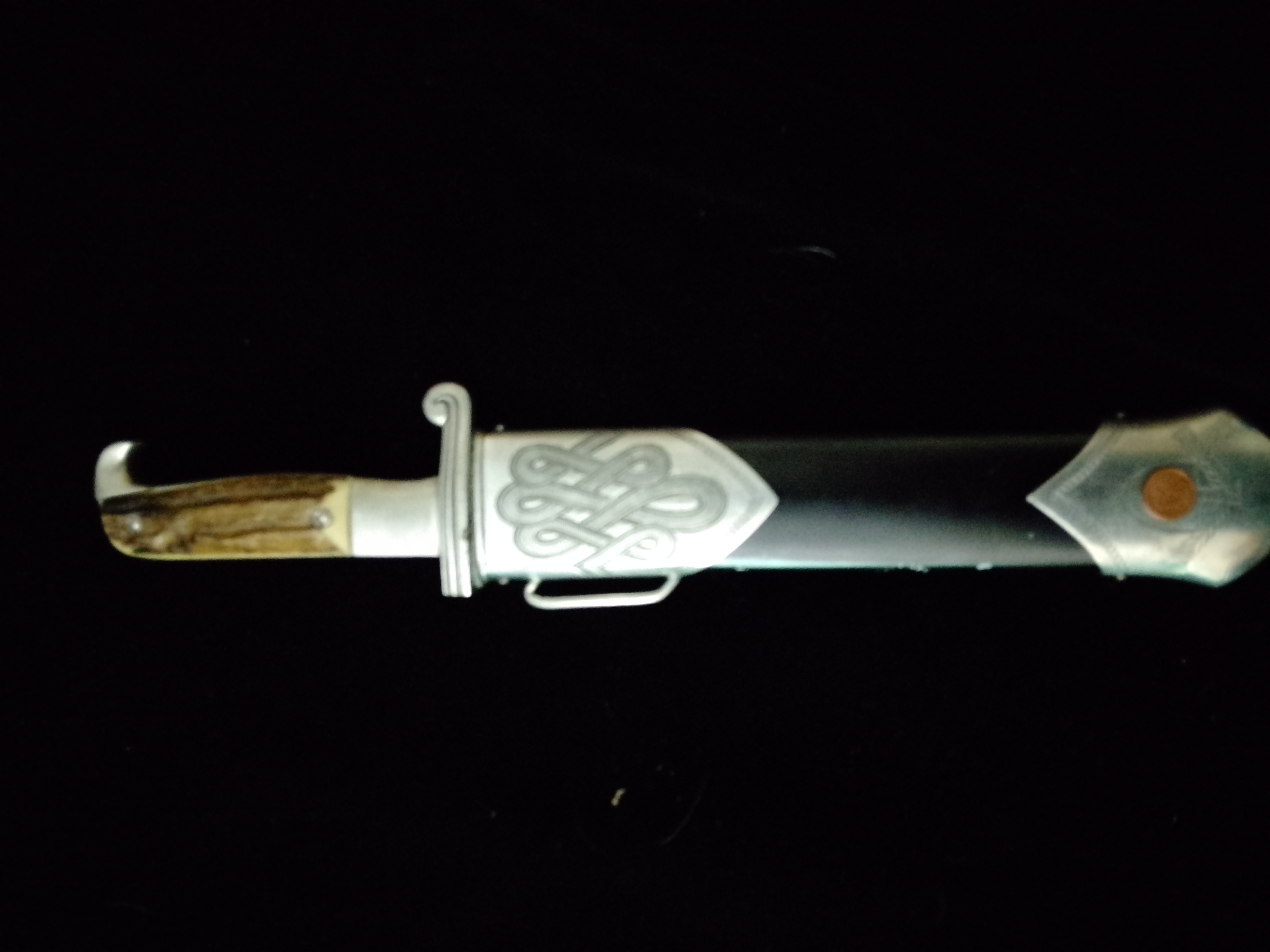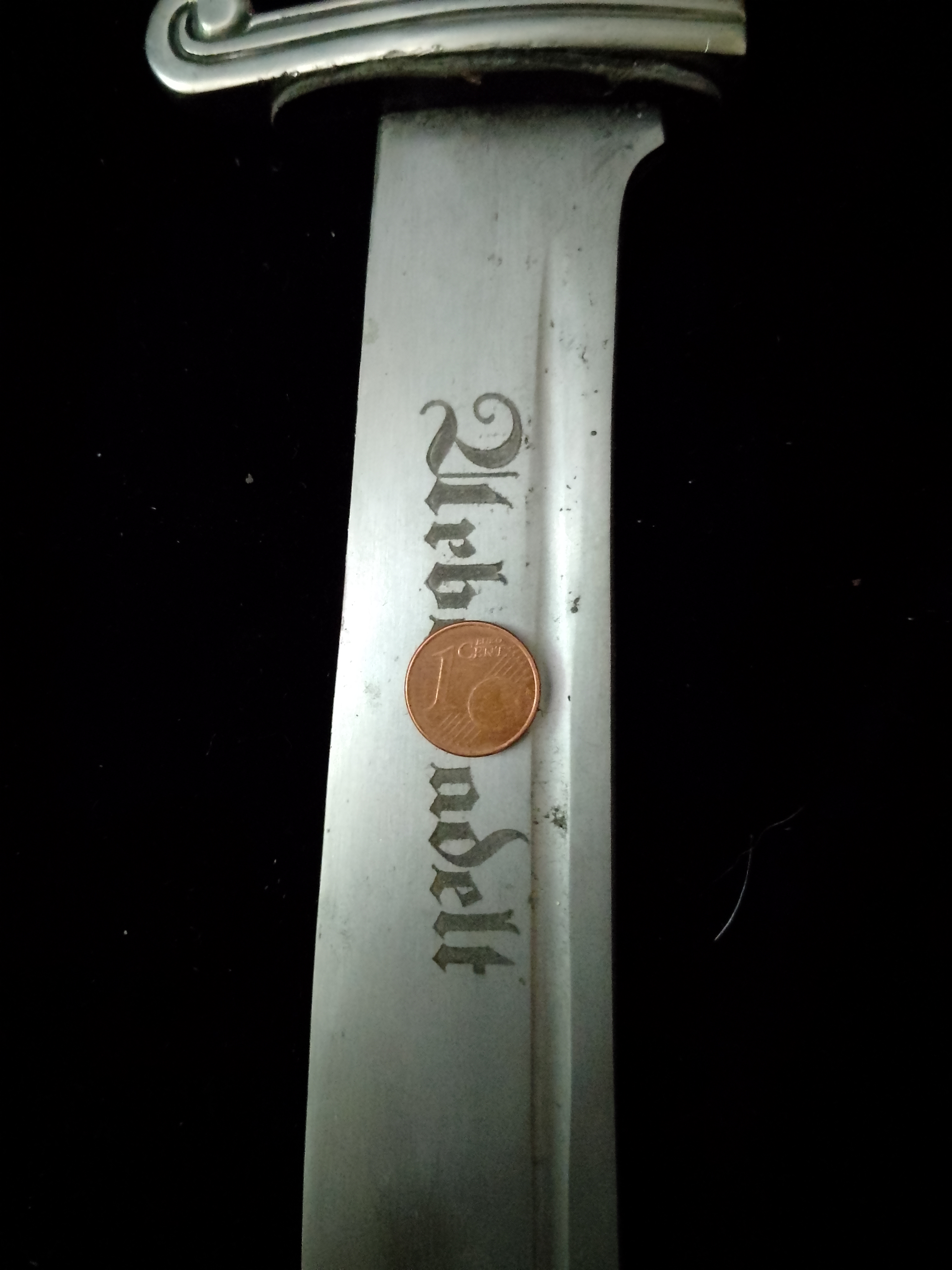 Ausführung der Firma Eickhorn in Solingen Griffstück aus poliertem Aluminium eloxiert, Griffschalen verschraubt stahlklinge vorderseitig mit Devise arbeit adelt rückseitig mit Ätzung Eickhorn und dem Dreieck der Rad.