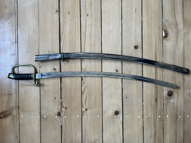 Aus Sammlungsauflösung wird ein russischer Kavalleriesäbel mit Scheide aus der Zarenzeit angeboten. Die ca. 73 cm lange Klinge ist ein wenig fleckig und weist leichte Korrosionsspuren auf. Fragmente einer Zierätzung auf der Klinge sind noch zu erkennen. Der Hersteller ist Alexander Coppel aus Solingen. Die blanke Stahlscheide mit einem Tragering aus Messing hat leichte Korrosionsspuren, ist aber beulenfrei. Ob es sich um die ursprünglich zugehörige Scheide handelt, ist unbekannt. Die schwarze Griffschale aus Hartholz hat Schrumpfungsrisse (siehe Fotos), die einzelnen Teile sitzen aber noch fest auf der Angel. Die Montur besteht aus Messing und hat auf der Parierstange einen Hersteller/Abnahmestempel "Skossijrev Sankt Petersburg" (frei aus dem Kyrillischen übersetzt) sowie ein nicht eindeutig zu identifizierendes Hoheitszeichen. Der Bügel mit der Parierstange hat ein wenig Spiel auf der Klinge. Der Verkauf dieses gebrauchten Artikels erfolgt von Privat unter Ausschluss jeglicher Gewährleistung, Garantie, Sachmängelhaftung und Rückgabemöglichkeit. SHIPPING ONLY TO DESTINATIONS INSIDE EU!
